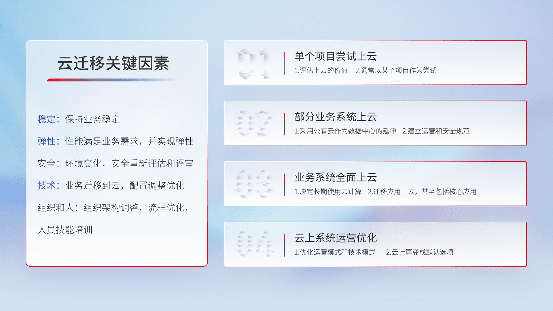 结合实际业务,,,从规划设计、、、云平台选型、、、云原生改造、、、、数据迁移、、、集成交付,,,迁移全过程为客户识别最佳上云路径,,,做好风险识别管理,,,设计网络架构、、身份权限、、安全审计合规、、、、操作审计、、、、日志审计、、、、监控告警策略、、、多站点容灾设计等,,对云上基础设施进行整体规划,,,提升IT治理水平,,以满足弹性、、、、高可用、、、高性能的需求。。。。